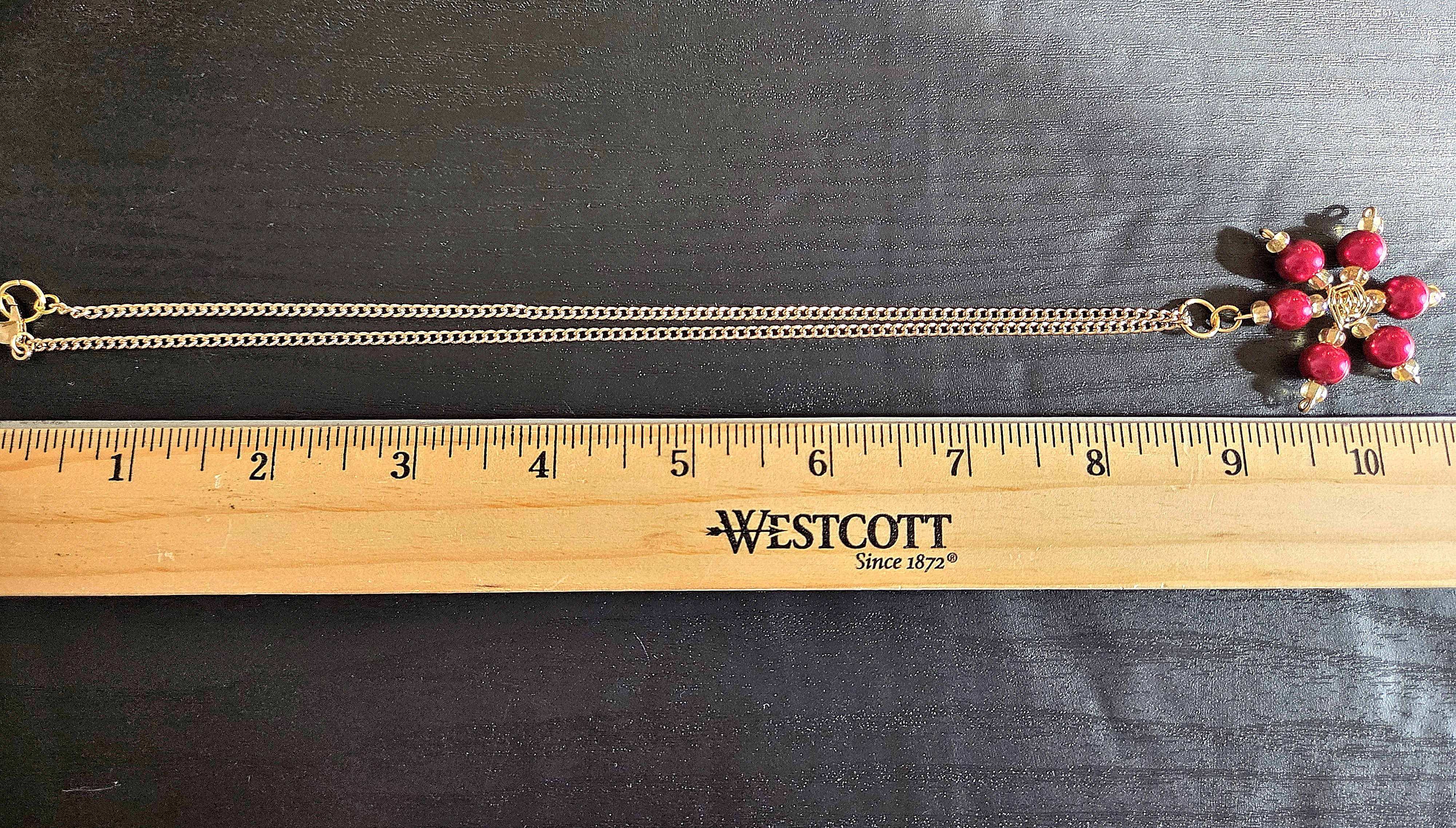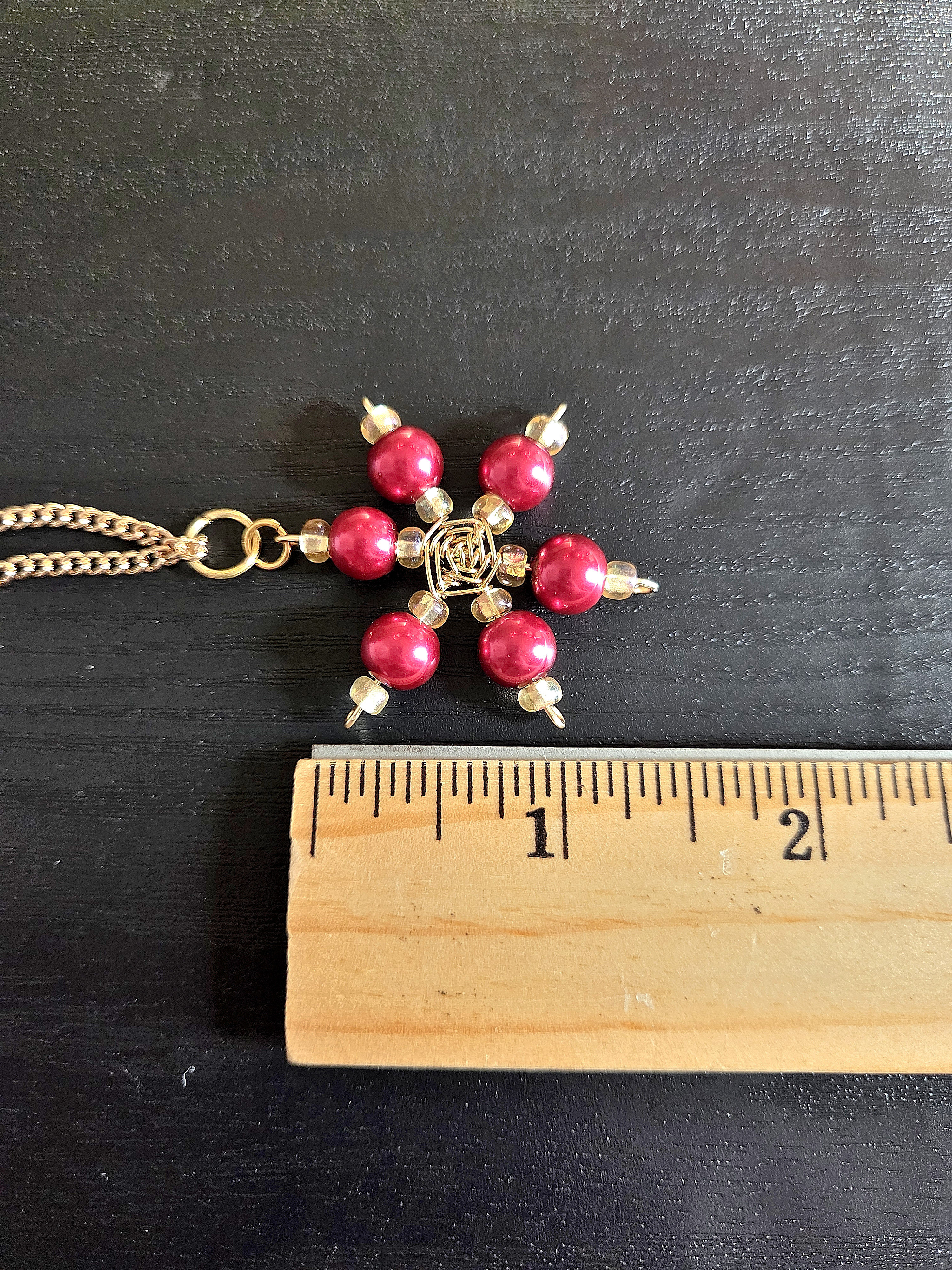 The snowflake pendants are handmade, using gold coated copper wire. I cut lengths of 2" and wrapped them together in the center with thinner wire, continuing the wire around the spokes of the snowflake to give it a pattern in the middle. I added beads to each spoke one side at a time, alternating ends so they didn't fall out of the wrap. I curled the ends once the beads were added so they didn't fall off that way, and I picked one loop to be the top of the pendant, adding jump rings to hang on the chain.