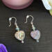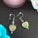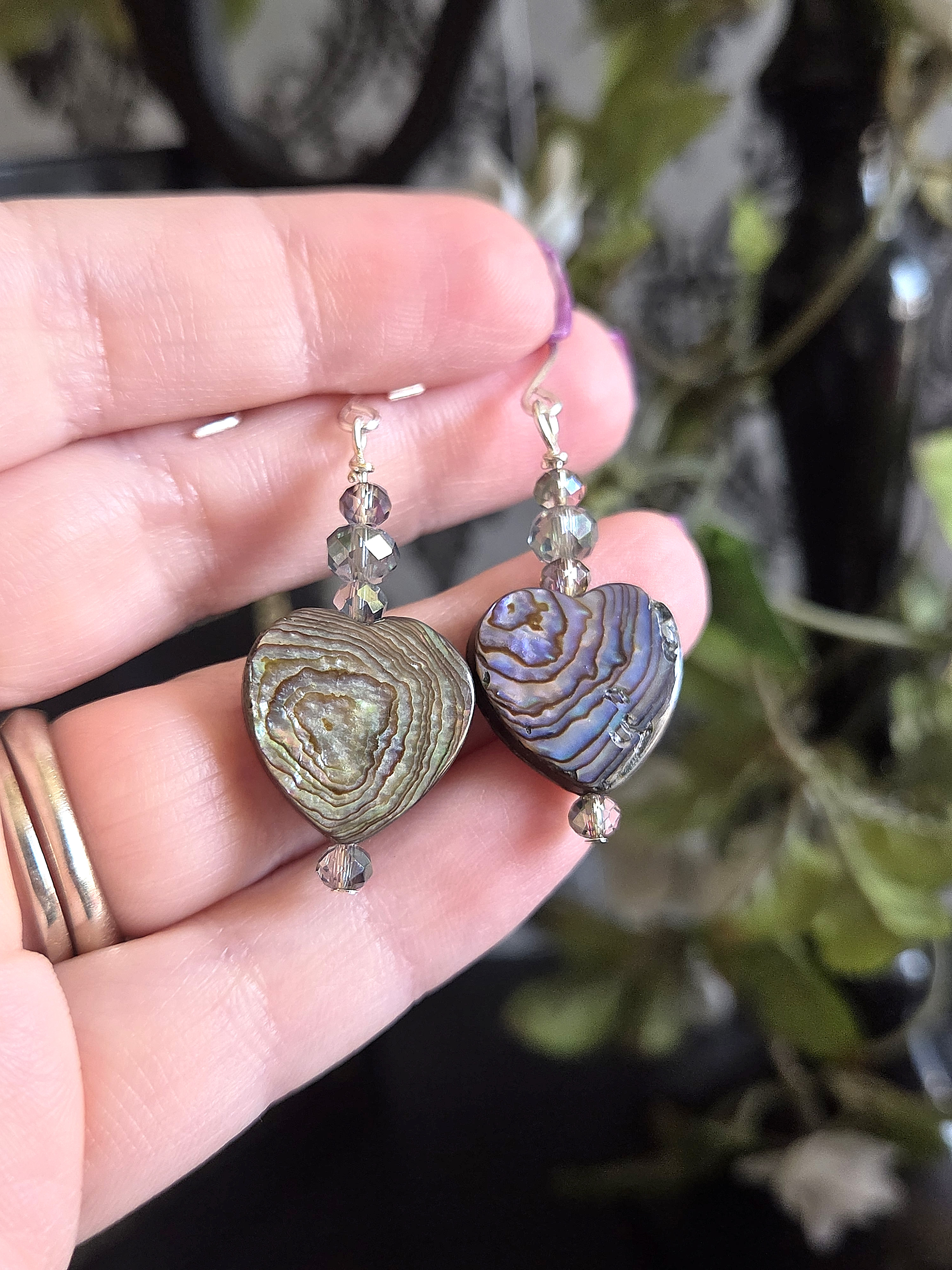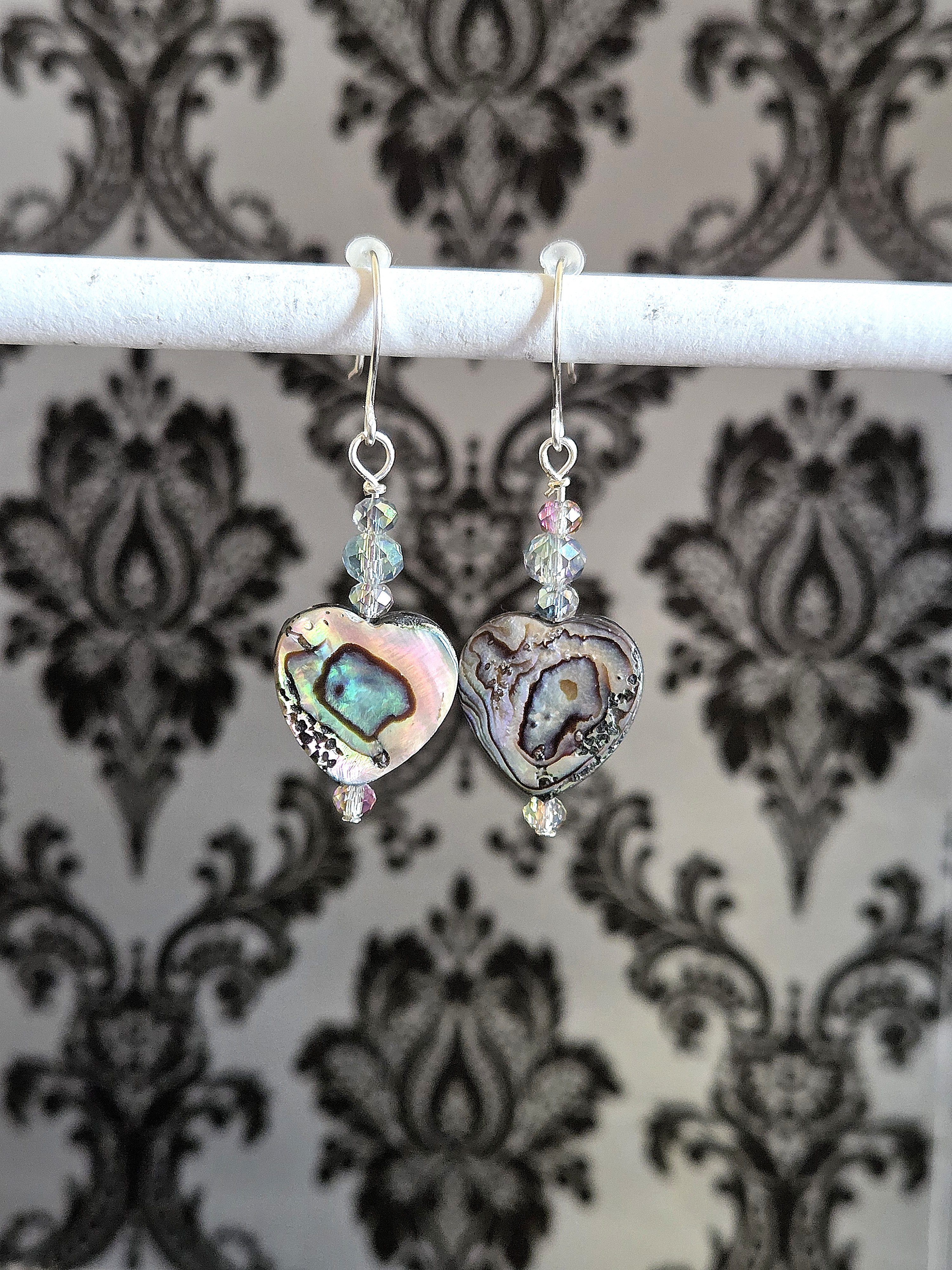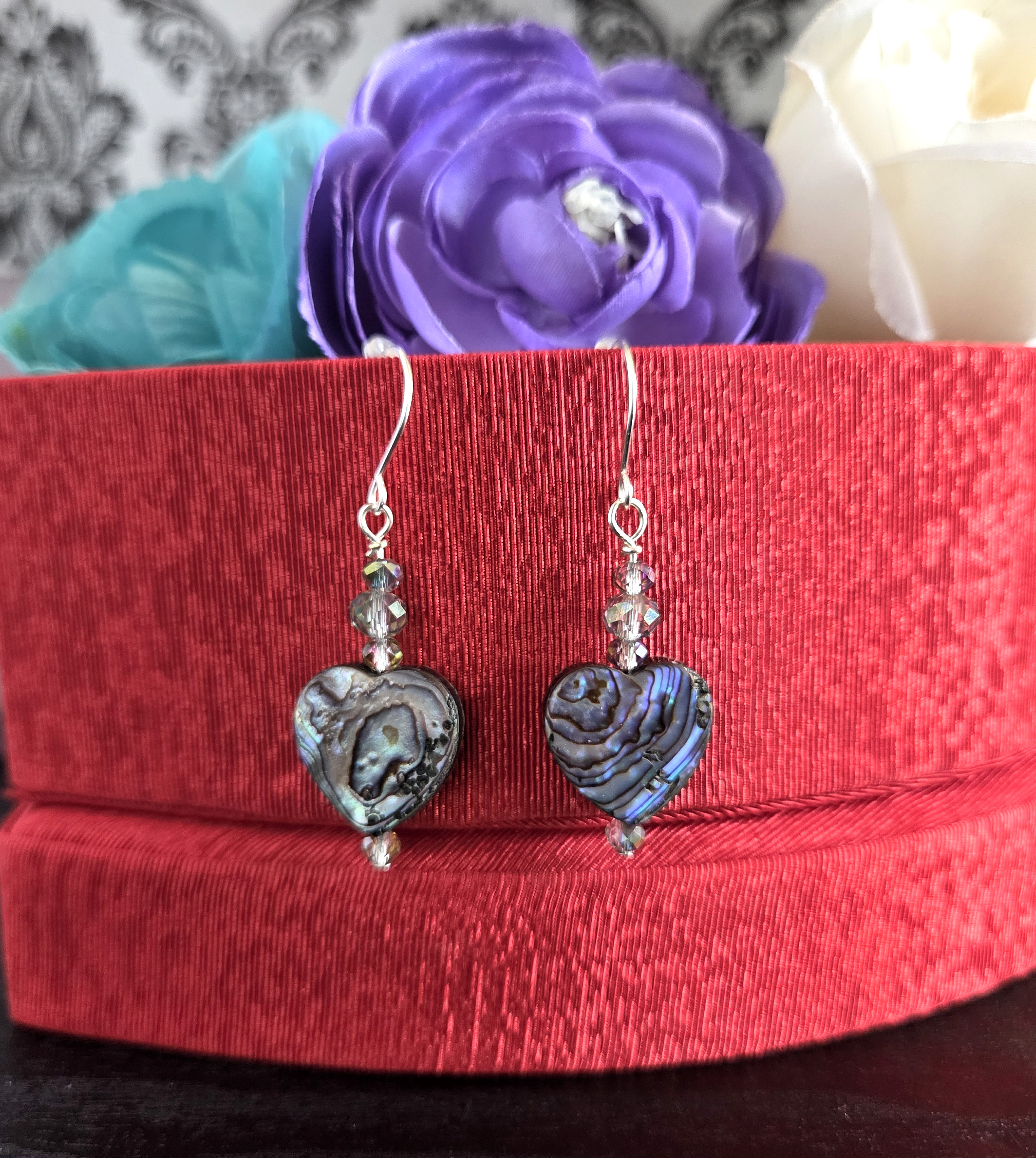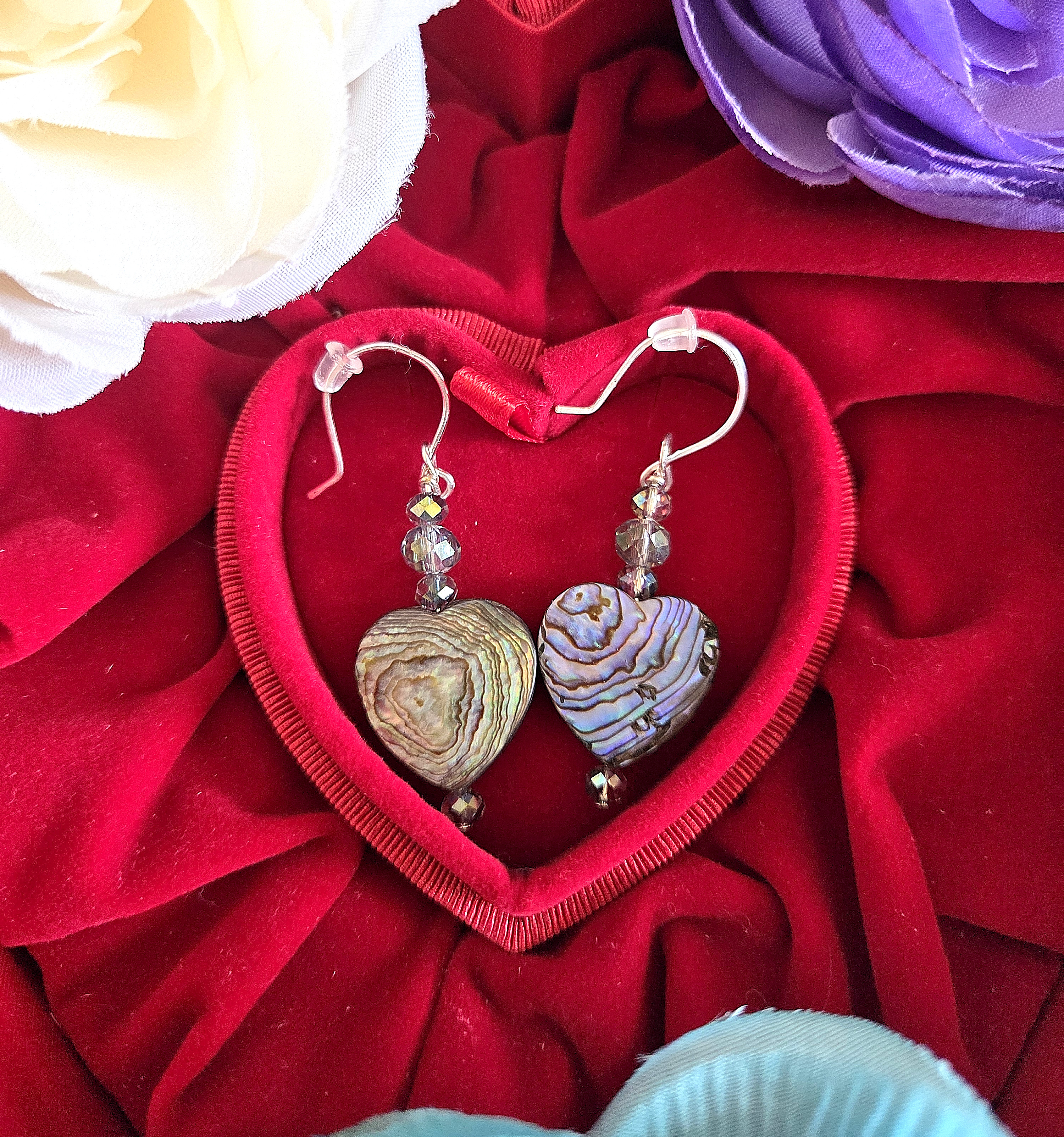 These romantic drop earrings feature a luminous, double-sided heart-shaped abalone shell bead that reflects dreamy flashes of blue, green, purple, and warm earthy tones as it moves. Three tiny faceted glass beads with a soft blue-green tint lead down to the heart, with one more shimmering bead finished at the base for an elegant, elongated silhouette. The shifting colors of the shell paired with the delicate sparkle of the crystals create a design that feels both ocean-inspired and deeply romantic. Finished on silver earring hooks, these lightweight earrings are perfect for Valentine’s Day, anniversaries, or anyone who loves heart-shaped jewelry with a vintage, Victorian-inspired touch.
