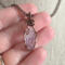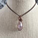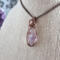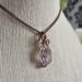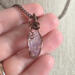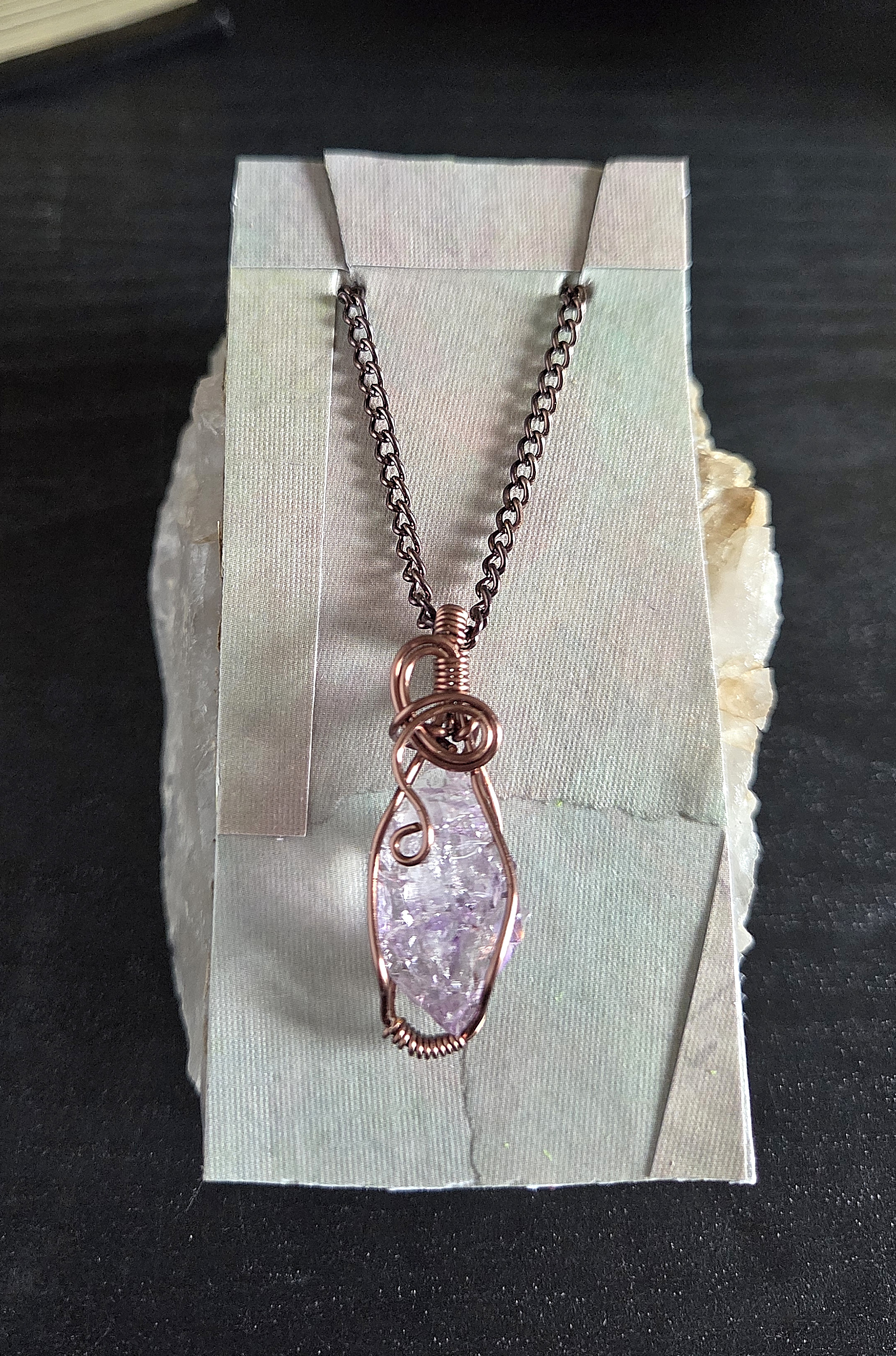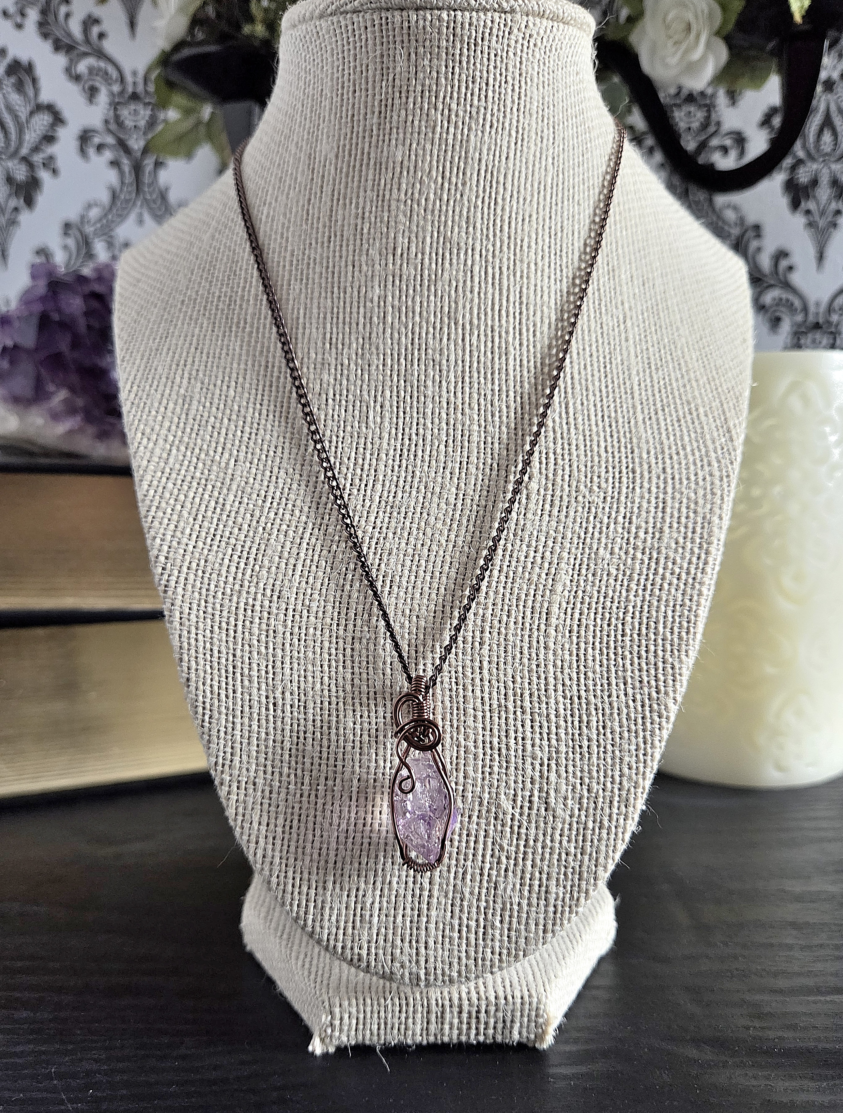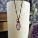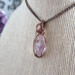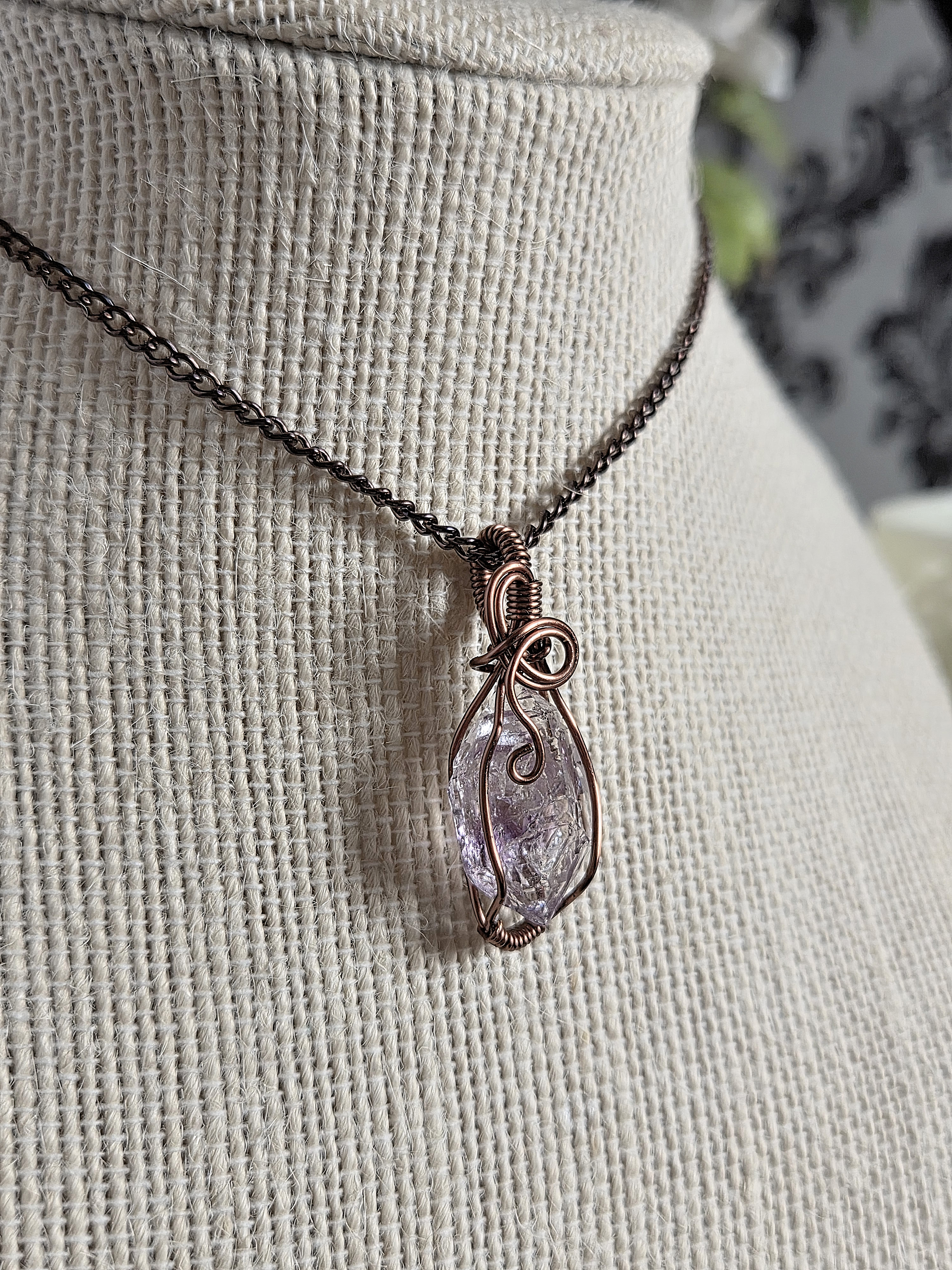 This handmade double-terminated amethyst necklace carries a quiet, old-world elegance. A genuine amethyst crystal point in a soft, light lavender hue rests within a carefully formed cage of antique copper-colored wire. The wrapping secures the sides and base of the stone, while gentle swirls extend from the bail and flow gracefully down the front. What makes this pendant especially unique is the tiny secondary point emerging naturally from the side of the crystal. This delicate detail is what gives the piece its one-of-a-kind character. The pale purple tones of the amethyst paired with the warm depth of antique copper create a balanced, harmonious look that feels both grounding and serene. Suspended from a simple antique copper chain, this pendant is designed for those drawn to meaningful gemstone jewelry, heirloom-inspired design, and a sense of quiet strength.
