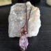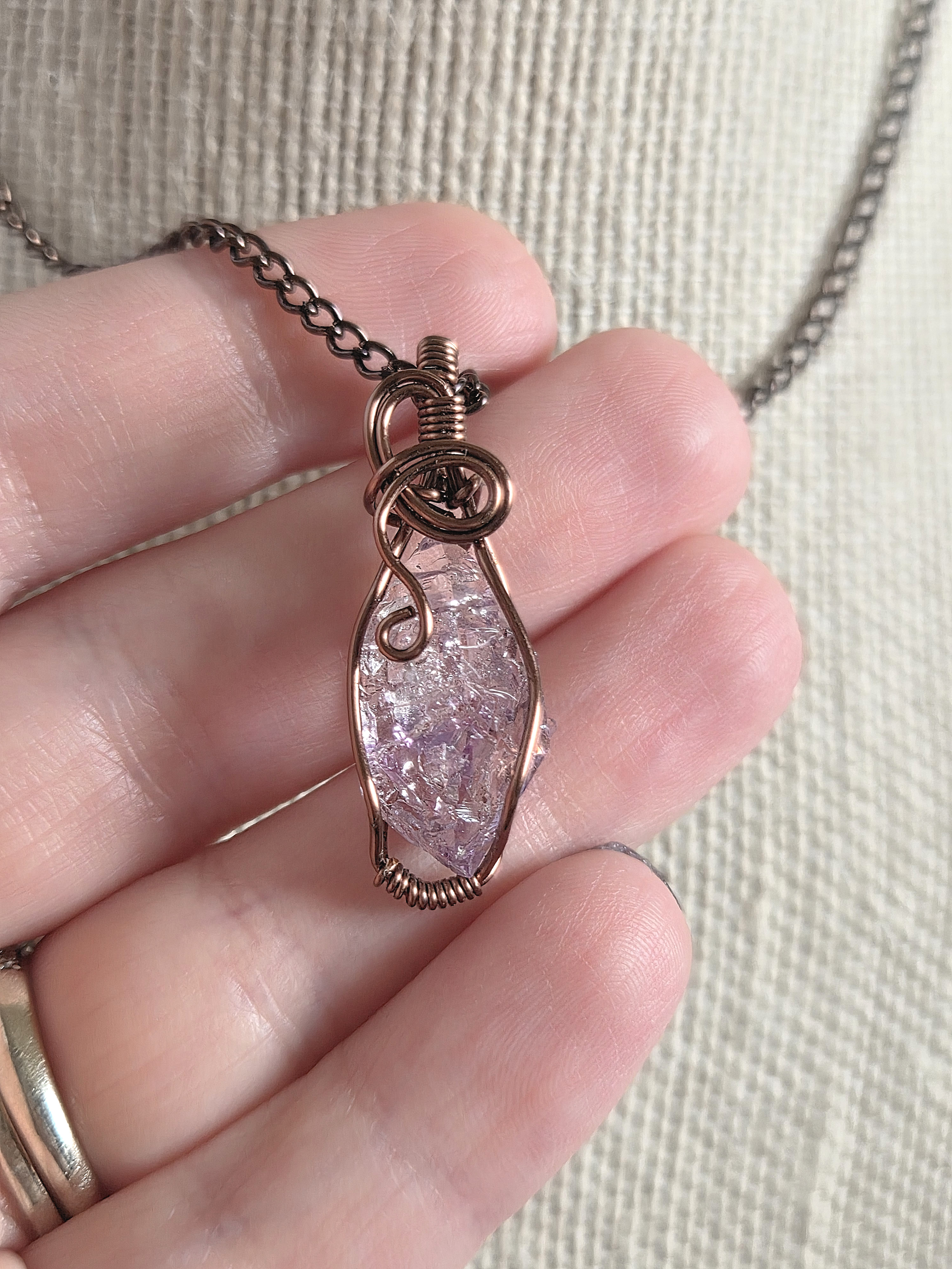 Wire-wrapped stones are usually a "go-with-the-flow" situation, with maybe a couple of rules to adhere to. This stone is double-terminated, super glassy, and has an adorable extra point growing out of the side, so I wanted to make sure that was visible, while also trying to keep the points visible and as much of the gemmy purple stone showing as well. I love intricate designs, so it was hard not to go all out for this piece, but after I got the main cage made so that it didn't cover the tiny extra point, I just let the flow of the wire take me, and I kept the design to the top. It is definitely an understated beauty with a raw exterior.