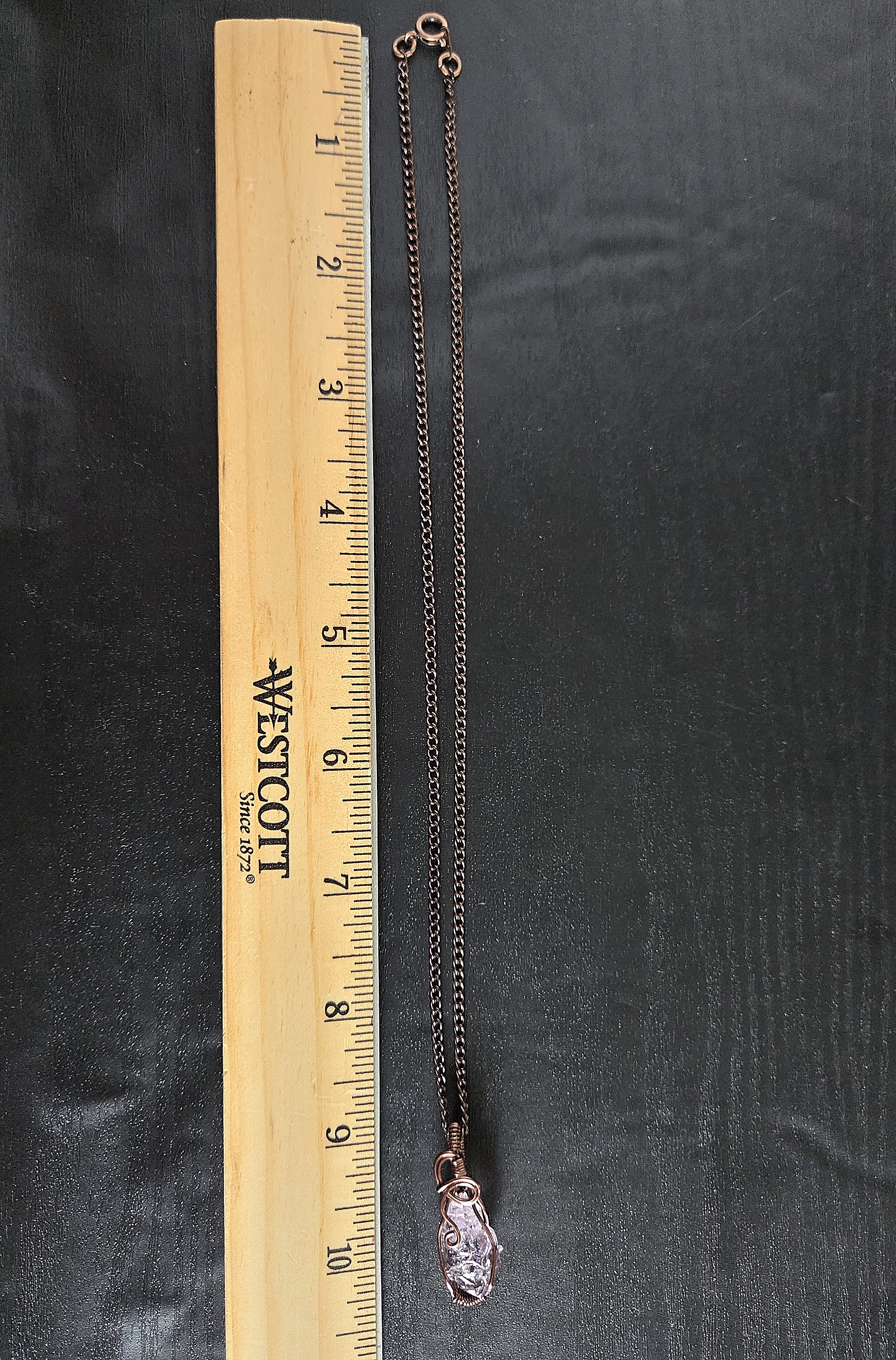 The pendant comes on an 18" antique copper-colored chain with a lobster clasp.