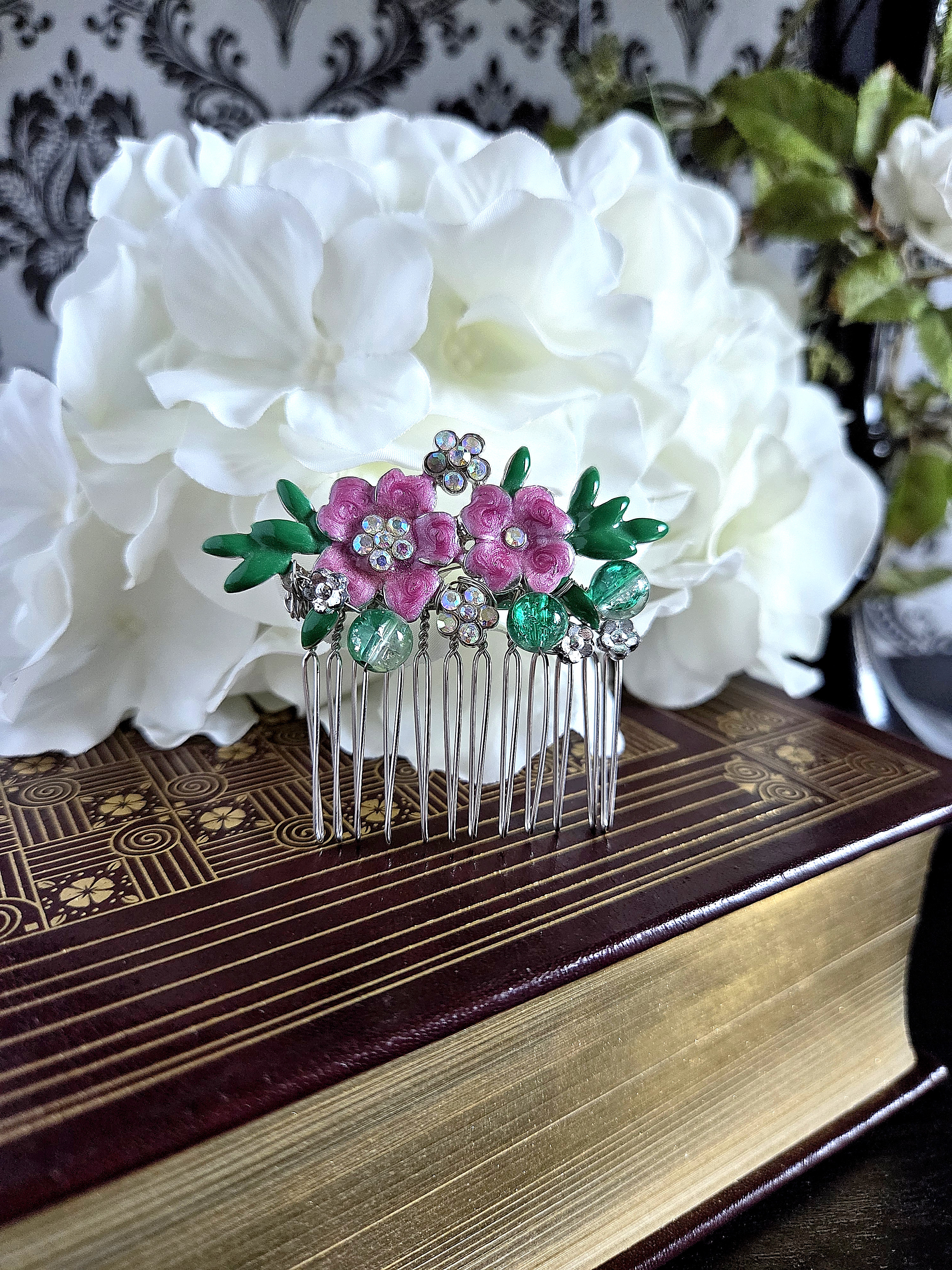 This silver hair comb is decorated with a focal piece of enameled purple flowers, green leaves, and tiny rhinestone blossoms. Wrapped by hand with crackled green glass beads and tiny metal flowers added, it creates a lush, garden-inspired design that feels both whimsical and timeless. Perfect for weddings, spring celebrations, or simply adding a vintage flourish to your everyday look, this floral hair accessory is a lovely way to bring a bit of Victorian-inspired beauty to your hairstyle.