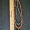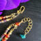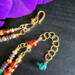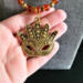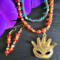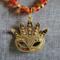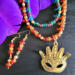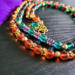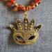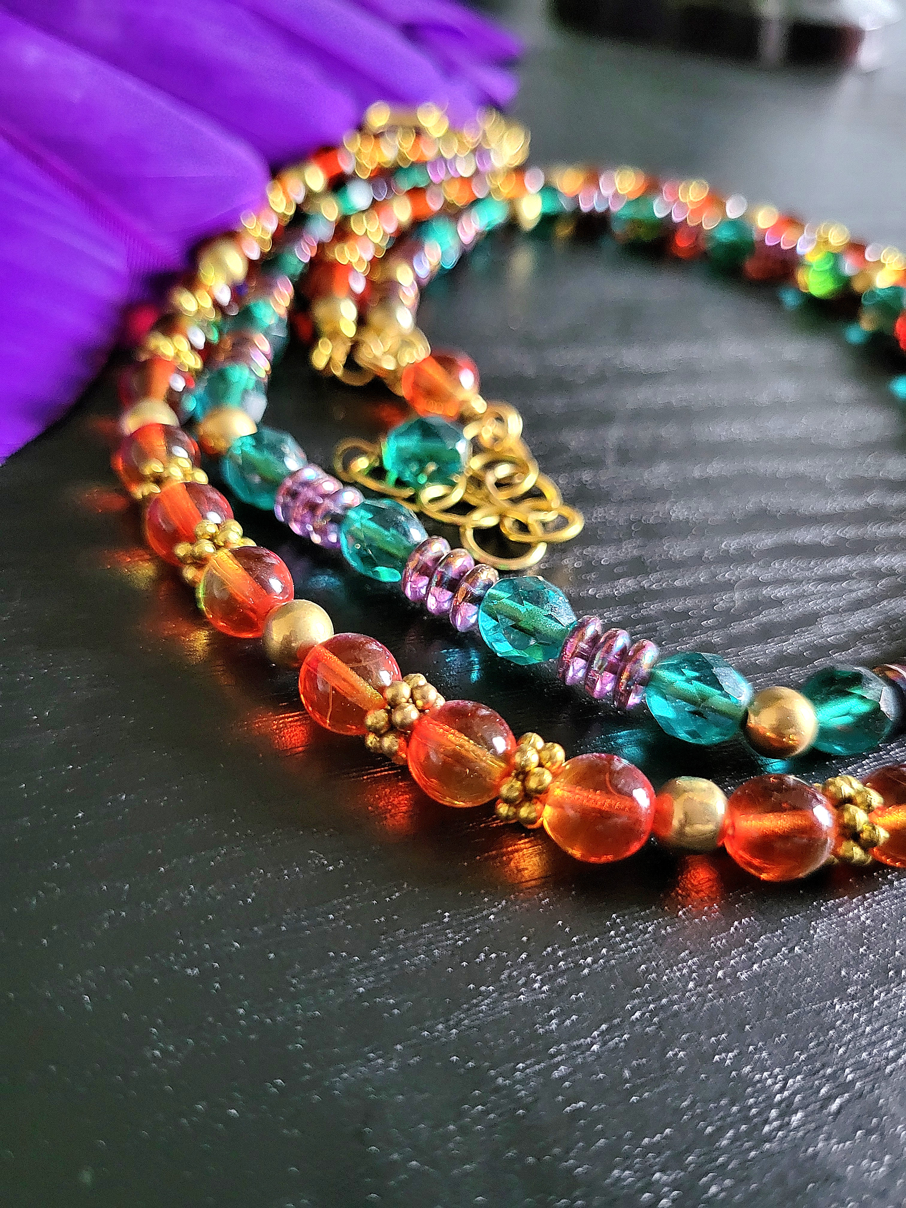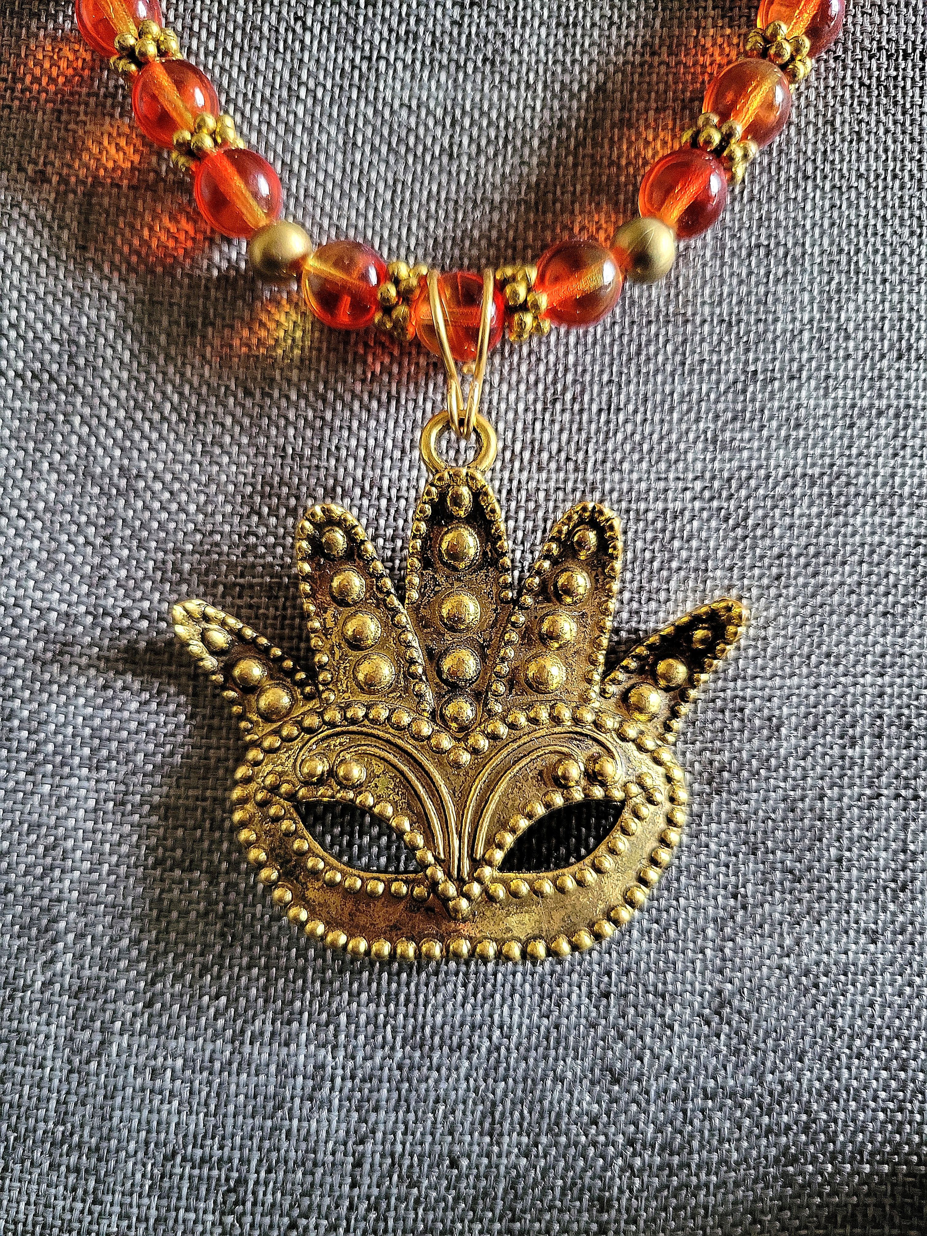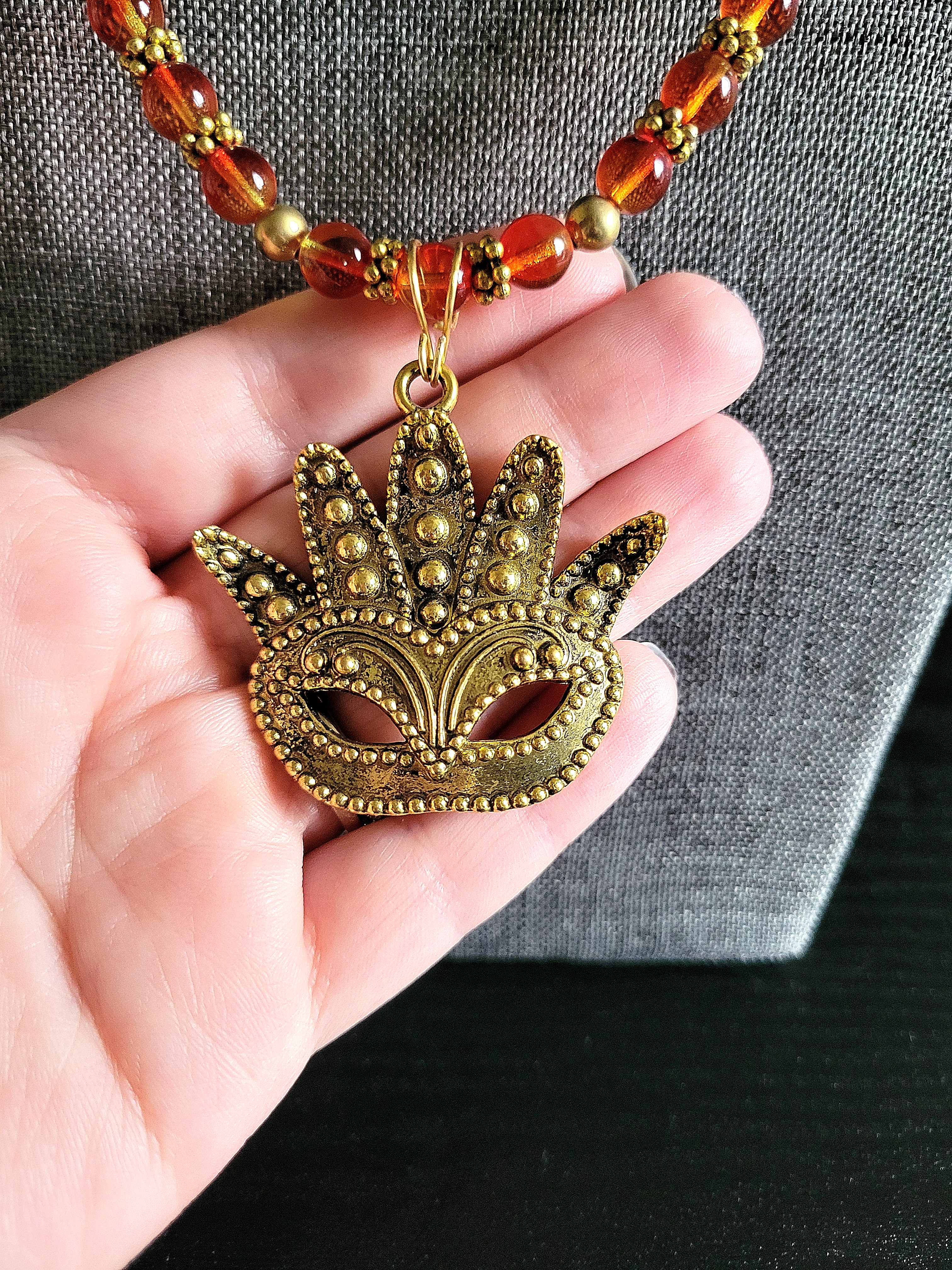 I used to be an art framer and I had many special edition Mardi Gras posters come across my counter to get framed. They were always gorgeous and so very colorful! I got my hands on the fire-orange round beads in the necklace and the masquerade pendant and knew that I had to find other vibrant, jewel-toned colors to blend together to make something spectacular for a Mardi Gras-inspired necklace. The purple and teal fit right in with the orange and from there I added in gold accents to match the pendant. After a LOT of playing around with patterns to get the lengths that I wanted, the pattern you see is the final result. I had to handcraft some findings on the ends to get the 2 strands to come together, and then added the hook and eye clasp. I also put on an extender chain so it can be adjustable, with a little flashy dangle bead on the end.