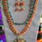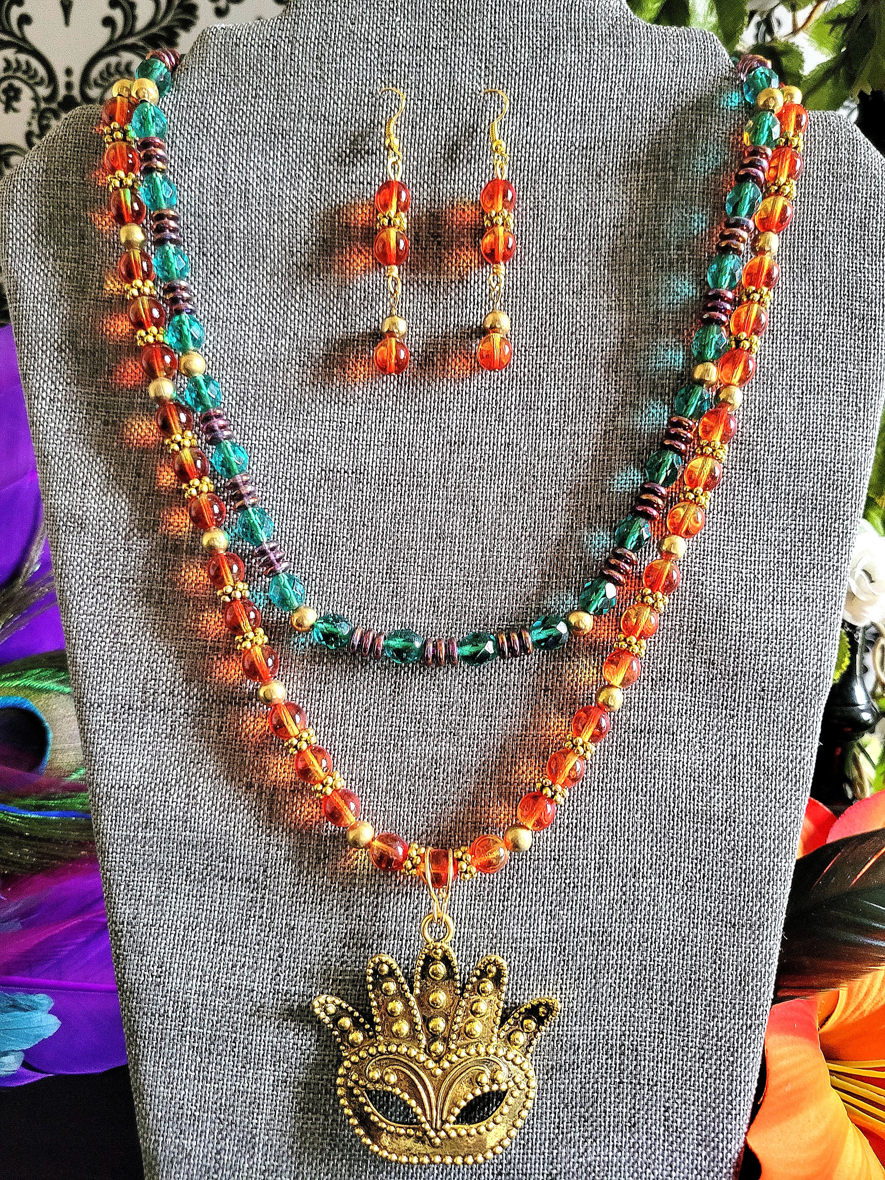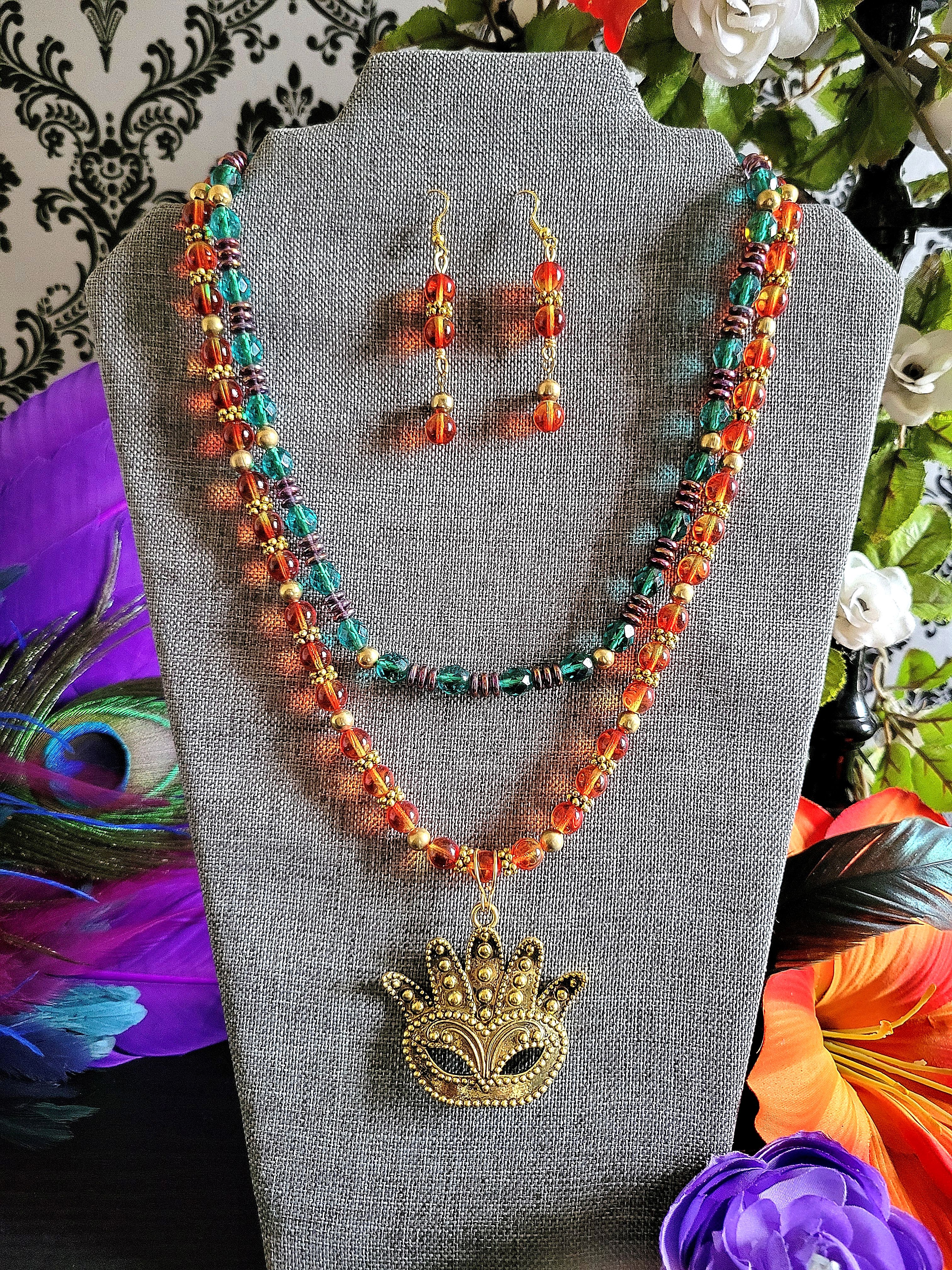 Inspired by the fantastical colors of Mardi Gras, this handmade double-strand necklace and earring set captures the drama and celebration of carnival season in rich teal, purple, gold, and fire-orange tones. The lower strand features glowing fire-orange round beads separated by gold spacer beads, leading to a gold-plated carnival mask pendant at the center. The shorter strand layers beautifully above with faceted teal beads accented by trios of purple luster disc beads, with gold spacer beads placed throughout for balance and shimmer. The necklace fastens with a gold hook and eye clasp and includes a gold extension chain for adjustable length, finished with a teal bead dangle. The matching long dangle earrings echo the fire-orange and gold bead design, creating a bold, stacked silhouette that feels festive yet elegant. This Mardi Gras jewelry set is perfect for carnival celebrations, masquerade parties, festivals, or anyone who loves statement jewelry in vibrant jewel tones.