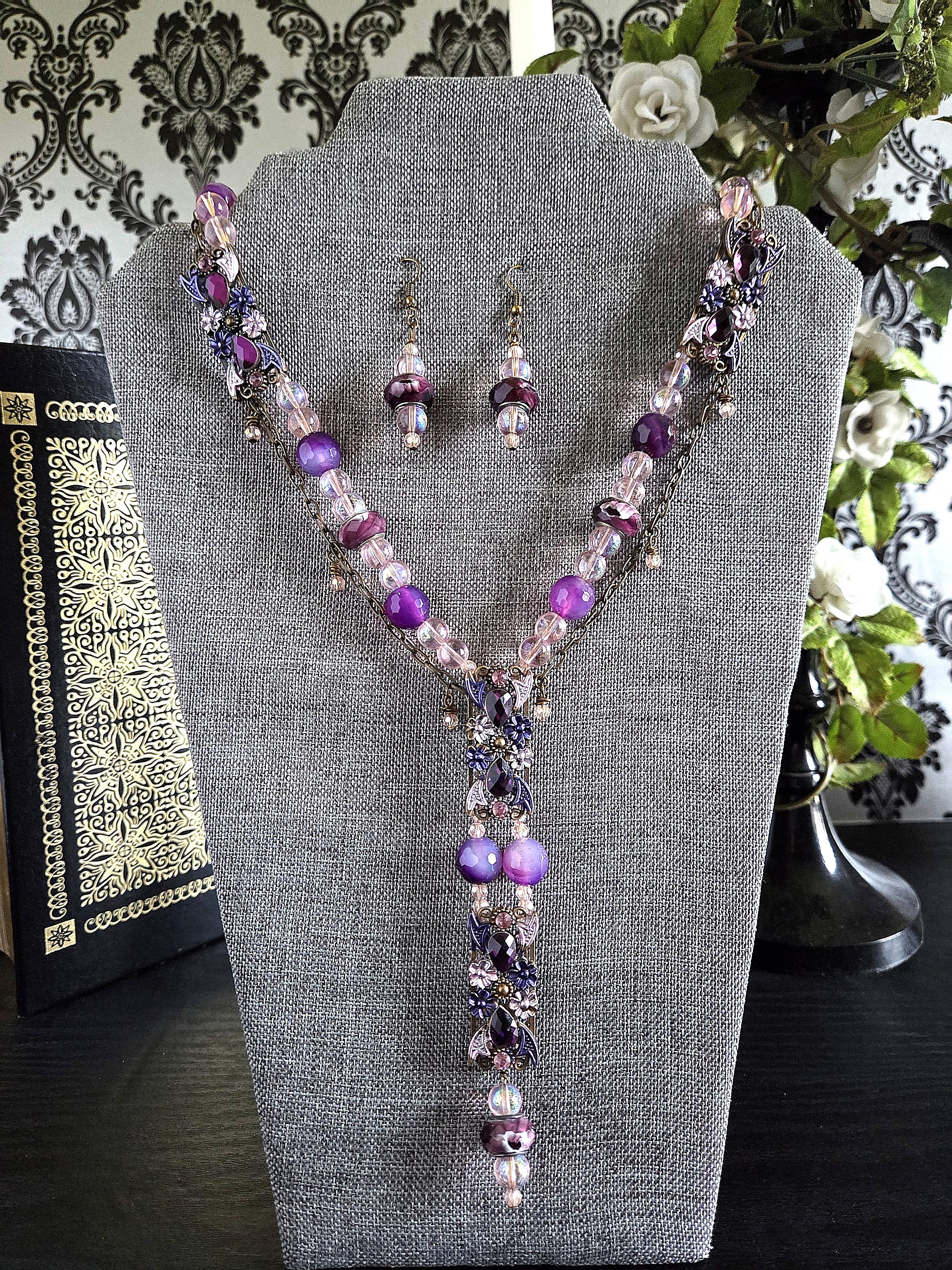 Step into a world of vintage charm and soft whimsy with this handmade Victorian-inspired Y-necklace and earring set. Rich bronze slider beads steal the spotlight, each adorned with painted pink and purple florals and sparkling rhinestones that evoke the elegance of antique jewelry. The necklace features a modern Y-shaped silhouette with delicate chain draping along the outer edge, while the strand is accented with bubble-like AB pink beads, faceted dyed purple agate, and marbled purple-and-white rondelles. The Y-drop continues the motif with alternating slider and gemstone beads, ending in a dangle that’s echoed in the coordinating earrings. Finished with a bronze toggle clasp, this whimsical statement set is a perfect blend of romantic Victorian flair and playful modern detail—ideal for garden weddings, fantasy events, or adding enchantment to everyday wear.