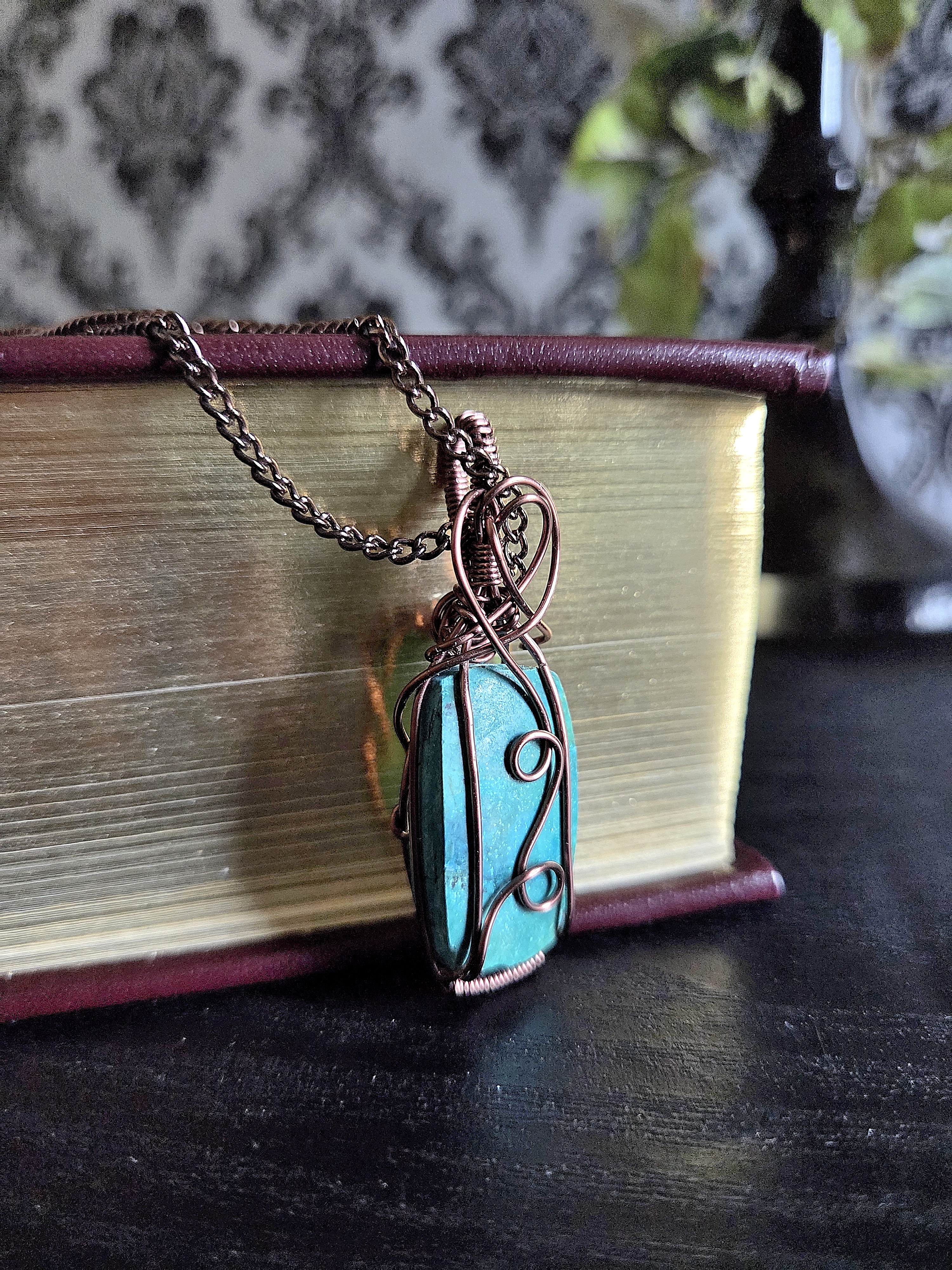 This handmade pendant necklace showcases a genuine Chrysocolla cabochon wrapped in warm antique copper-colored wire. The natural stone has a striking blue-green hue, full of depth and character, making this pendant one-of-a-kind. The wire is carefully shaped into a secure frame that flows into soft swirls and curves across the surface of the stone, adding texture and movement to the design. A simple wire bail tops the pendant, with a small wire rose hidden on the backside. Perfect for anyone who loves unique gemstone jewelry with a touch of rustic, earthy charm.