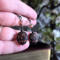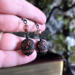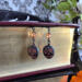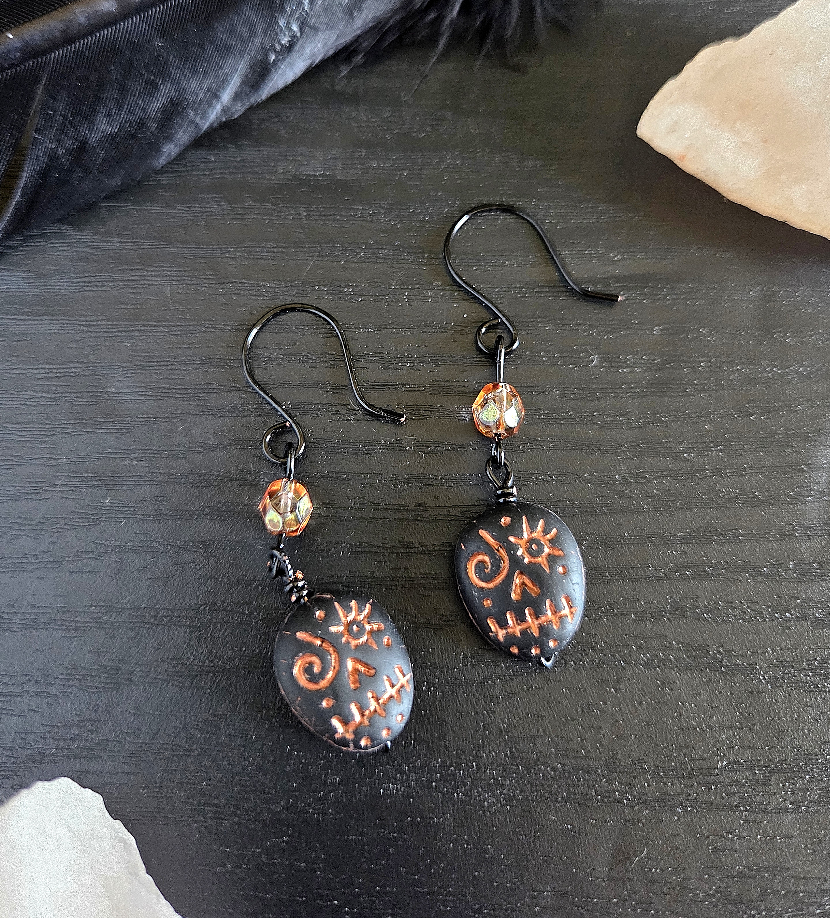 Channel your inner shadow witch with these hauntingly elegant skull earrings. Each earring features a black skull bead etched with mysterious symbols — a swirling eye, a sun-like gaze, and a quiet grin marked in a coppery orange wash that glows against the dark surface. Above it rests a faceted glass bead in a burnished copper tone, mirroring the glint of candlelight on ancient metal. Every detail is hand-wrapped in black coated copper wire and finished with handcrafted ear hooks for a seamless gothic finish. These earrings are a spell in metal and glass — subtle yet powerful, perfect for those who walk in the shadows of beautiful darkness.